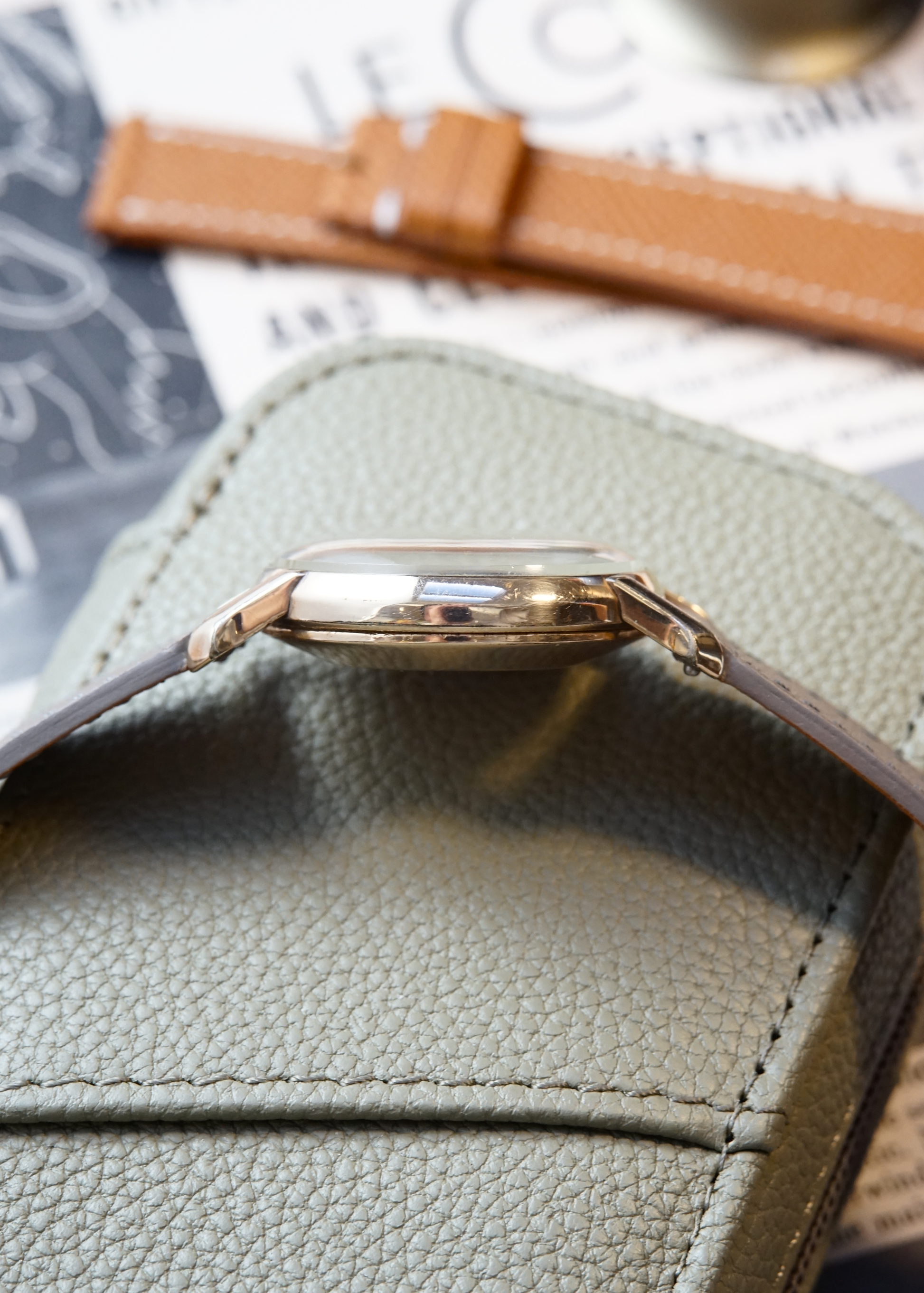 Produced for only eight years between 1951 and 1958, the LeCoultre Futurematic has a relatively brief production run, making it a relatively rare sight in vintage horology. This example, the reference E501, features a 10k gold-filled case with distinctive sword-shaped lugs — a less common variation among Futurematics, which are more often seen with long, slender or horn-style lugs. Personally, I find this design the most wearable: less ornate than the horn-lug versions yet more visually engaging than the simpler, elongated ones.