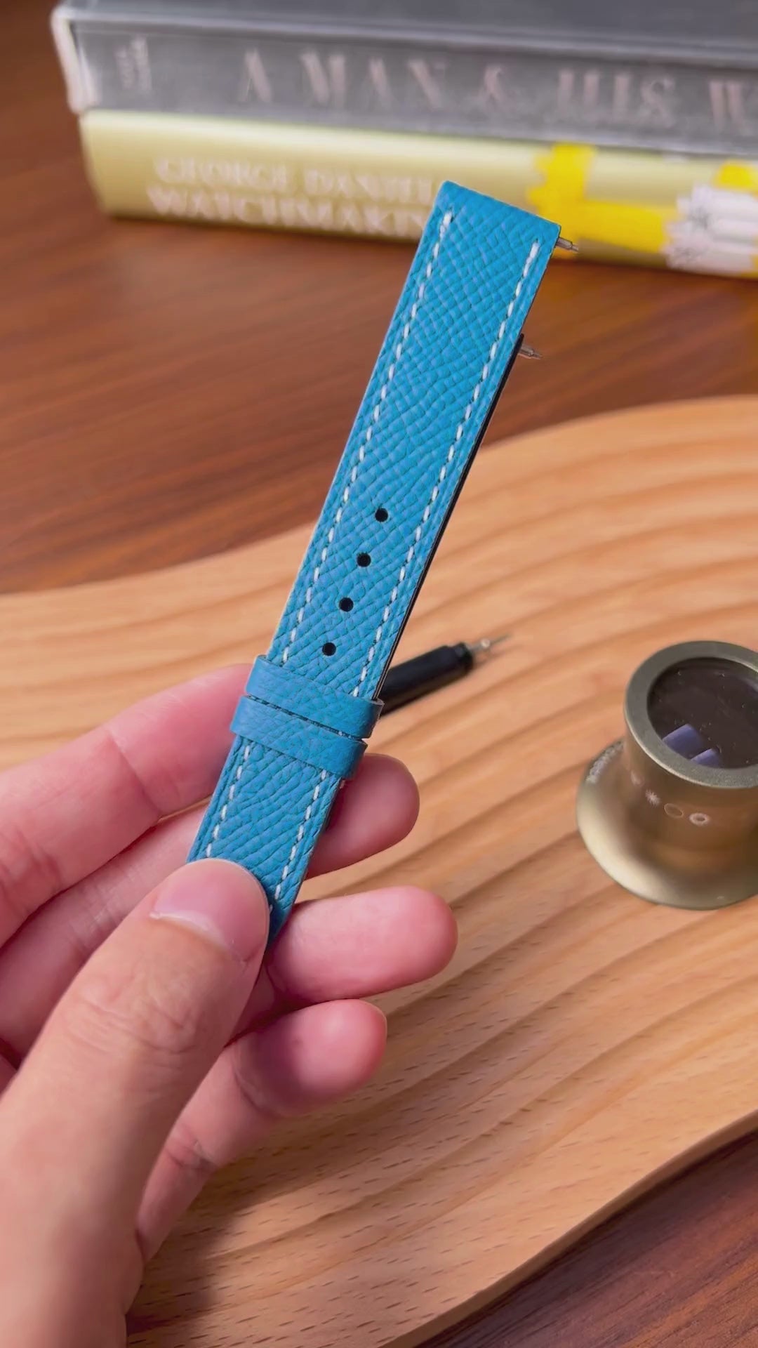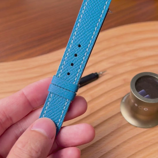 About this watch strap: The Azulene Blue Epsom leather strap introduces a vibrant yet sophisticated color to your watch collection. Its deep blue tone bridges the gap between vintage nautical watches and contemporary design pieces. The structured Epsom leather provides a refined, luxurious finish.