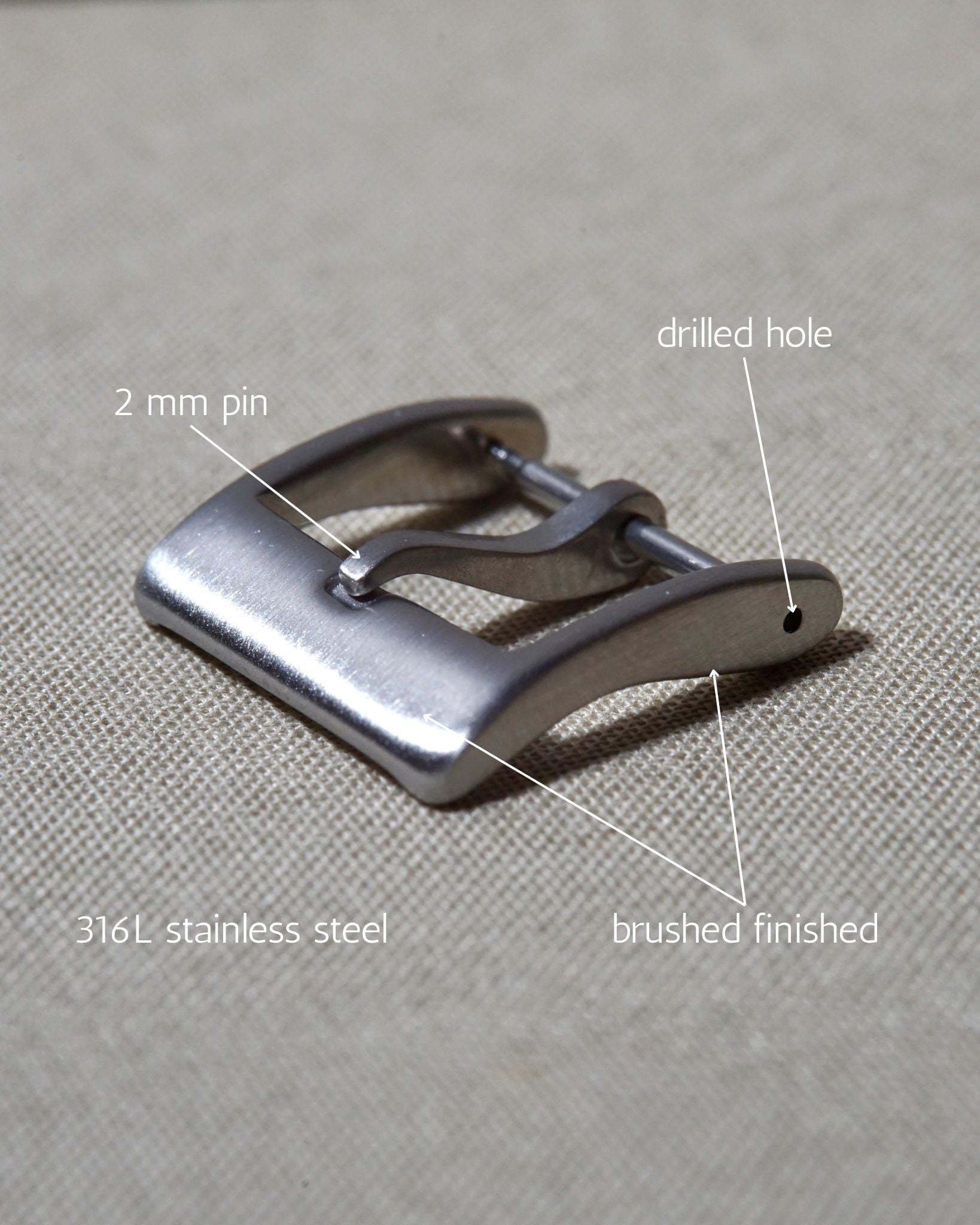 Designed with clean lines and a slimmer profile than our Classic Buckle, this iteration features two side-drilled holes for effortless strap changes. The uniform brushed texture across all facets creates a cohesive, modern aesthetic that works seamlessly with leather, rubber or NATO straps.