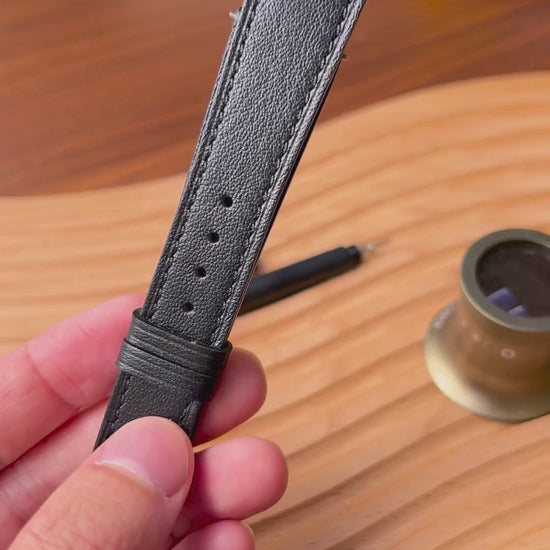 About this watch strap: The perfect foundation for any watch collection, this timeless black leather strap effortlessly bridges eras and styles. Its deep, uniform color and luxuriously smooth finish complement everything from vintage Swiss masterpieces to contemporary haute horlogerie. The understated elegance of this strap ensures it remains perpetually stylish—always appropriate, never overpowering.